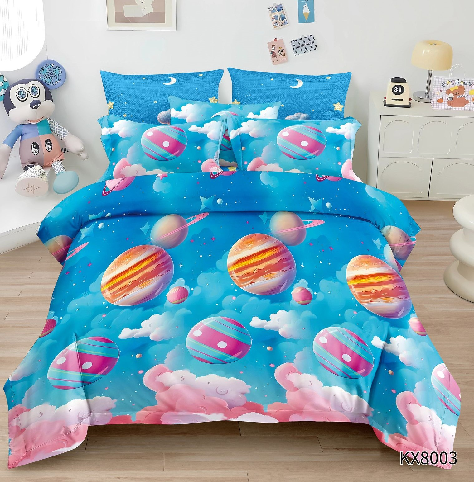 Set lenjerie de pat 1 persoană din Finet Premium, cu imprimeuri animate vesele (unicorni, fluturi, ursuleți, planete). Material moale și rezistent, ușor de întreținut. Conține husă pilotă, cearceaf clasic și 2 fețe de pernă.