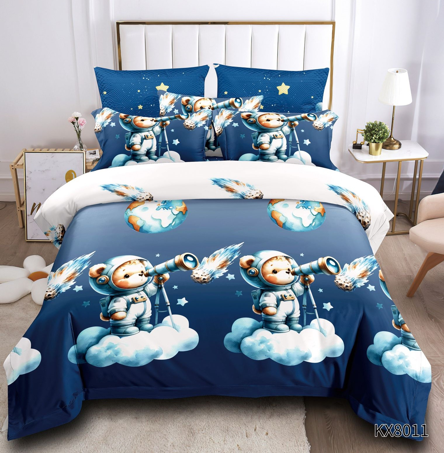 Set lenjerie de pat 1 persoană din Finet Premium, cu imprimeuri animate vesele (unicorni, fluturi, ursuleți, planete). Material moale și rezistent, ușor de întreținut. Conține husă pilotă, cearceaf clasic și 2 fețe de pernă.