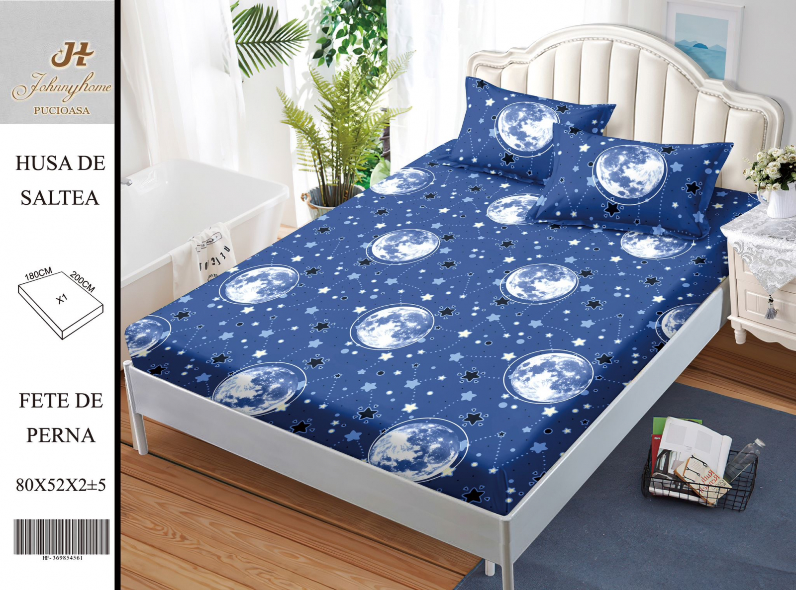 ELEGANT HOME PUCIOASA Husa de pat cu elastic 180x200 din Bumbac Finet + 2 Fete de Perna - Moon