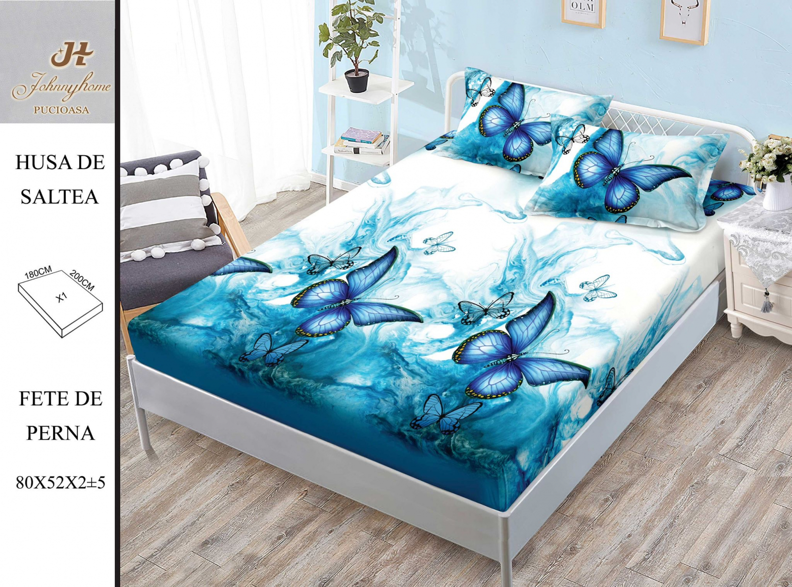 ELEGANT HOME PUCIOASA Husa de pat cu elastic 180x200 din Bumbac Finet + 2 Fete de Perna - Fluturi Turcoaz
