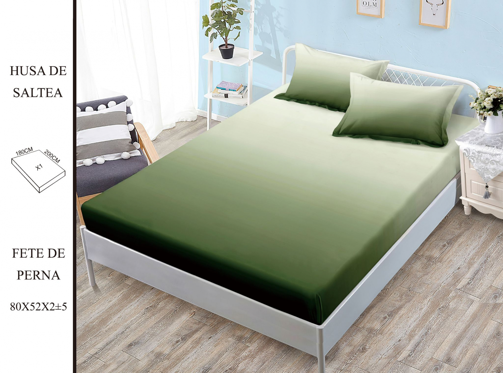 ELEGANT HOME PUCIOASA Husa de pat cu elastic 180x200 din Bumbac Finet + 2 Fete de Perna - Verde Ombre