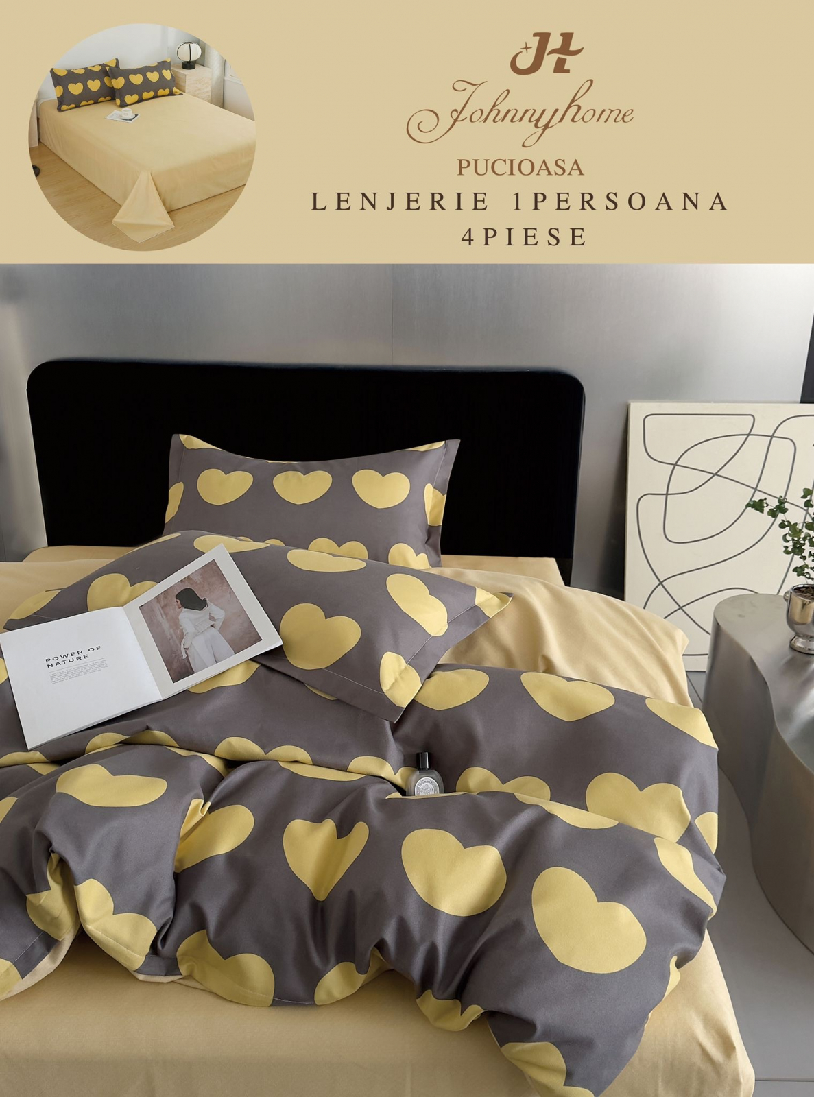 ELEGANT HOME PUCIOASA Lenjerie De Pat 1 Persoana, 4 Piese, Bumbac Finet - Inimioare Galbene