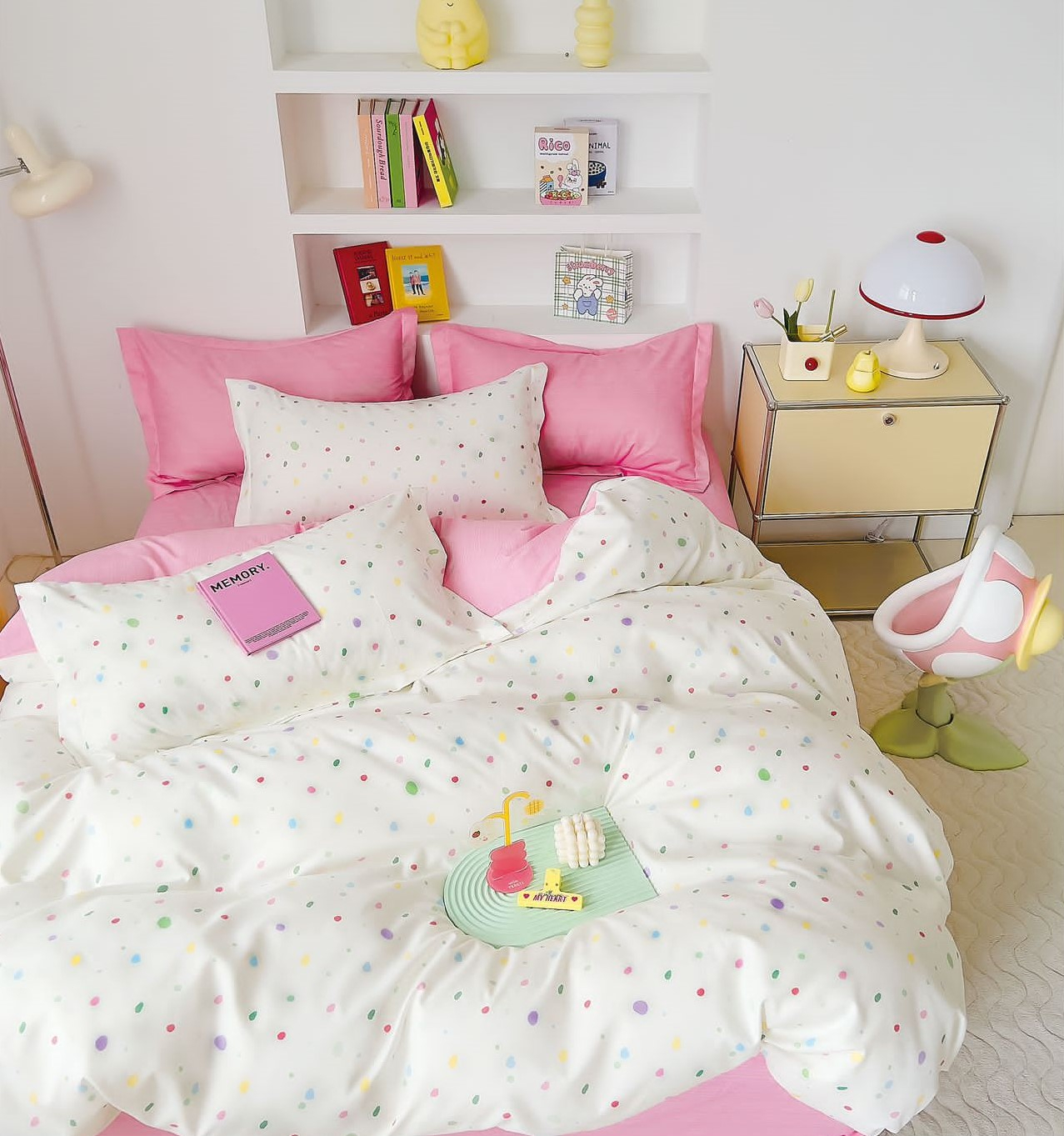 ELEGANT HOME PUCIOASA Lenjerie Din Bumbac Tip Finet 6 Piese Pentru Pat Dublu - Roz/Alb cu Buline