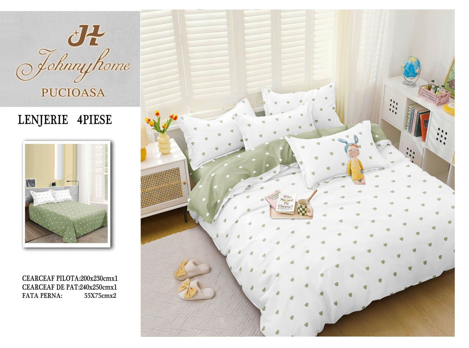 ELEGANT HOME PUCIOASA Lenjerie Pat Dublu, 4 Piese, Bumbac Satinat Superior - Alb / Verde, LP-EBSS-98