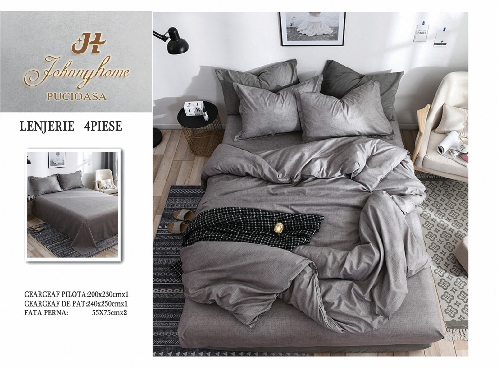 ELEGANT HOME PUCIOASA Lenjerie Pat Dublu, 4 Piese, Bumbac Satinat Superior - Gri Deschis, LP-EBSS-111