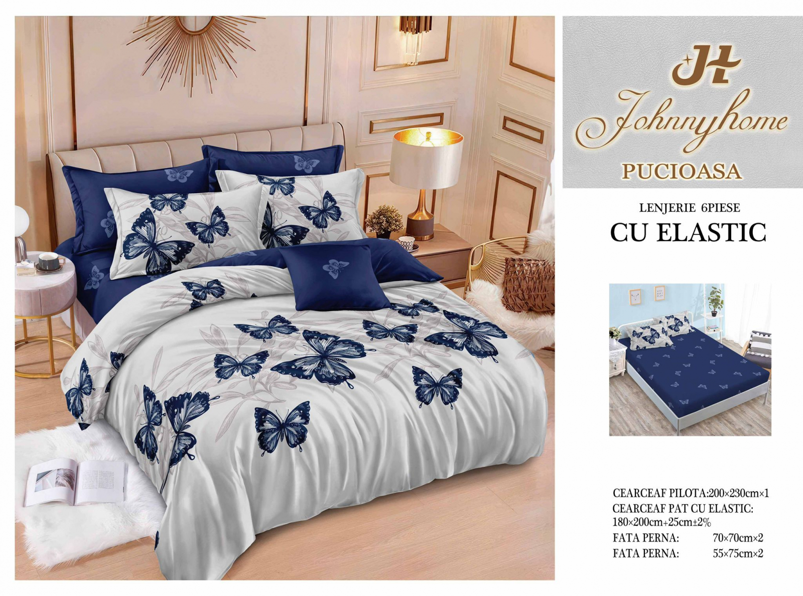 ELEGANT HOME PUCIOASA Lenjerie Pat Dublu, Bumbac Finet, 6 Piese, CU ELASTIC - Fluturi Albastri