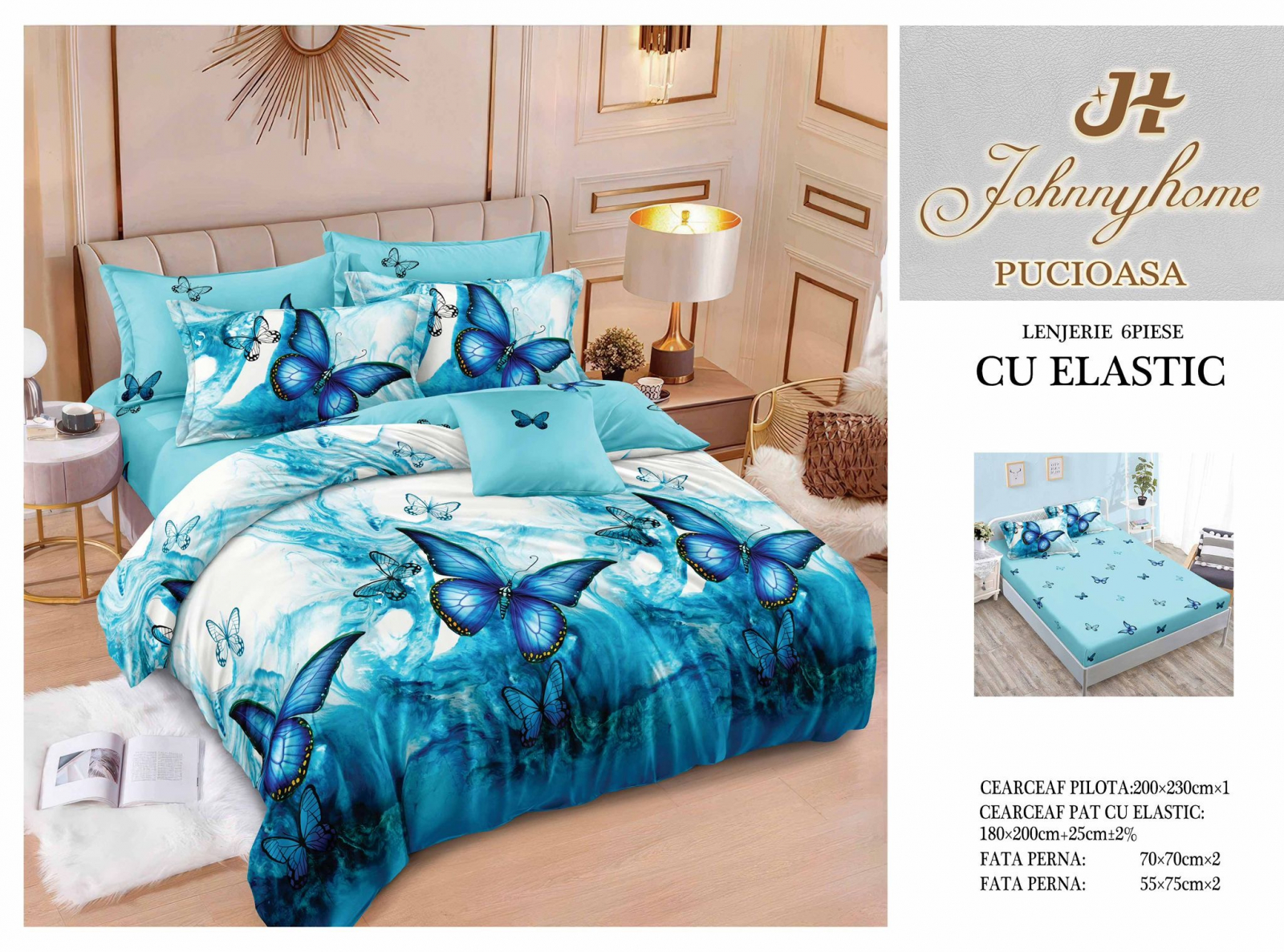 ELEGANT HOME PUCIOASA Lenjerie Pat Dublu, Bumbac Finet, 6 Piese, CU ELASTIC - Fluturi Turcoaz