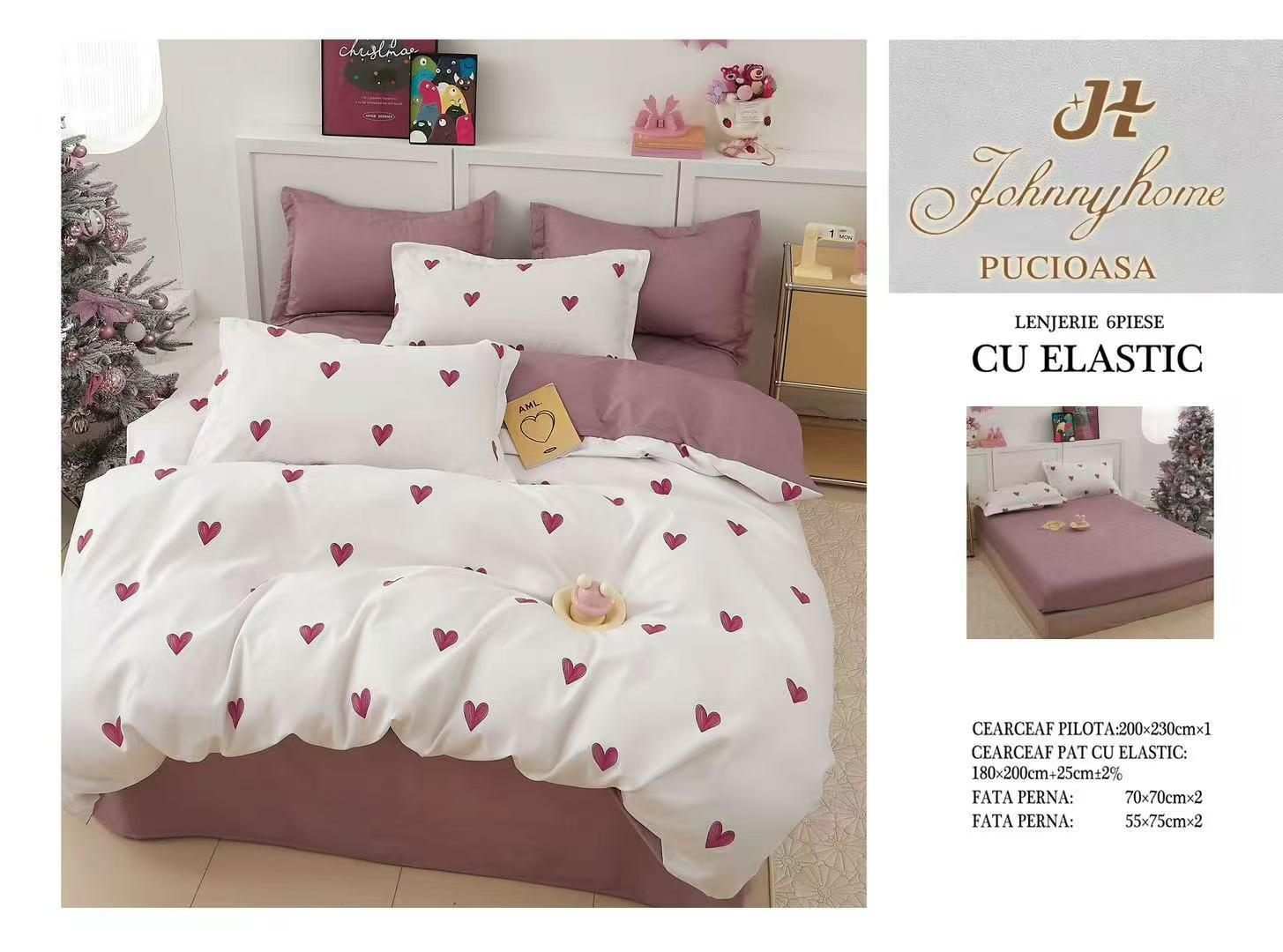 ELEGANT HOME PUCIOASA Lenjerie Pat Dublu, Bumbac Finet, 6 Piese, CU ELASTIC - Inimioare