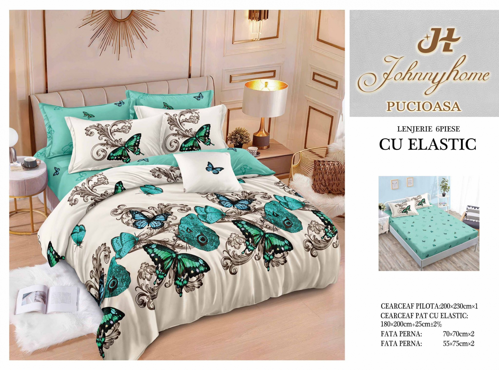 ELEGANT HOME PUCIOASA Lenjerie Pat Dublu, Bumbac Finet, 6 Piese, CU ELASTIC - Fluturi Colorati