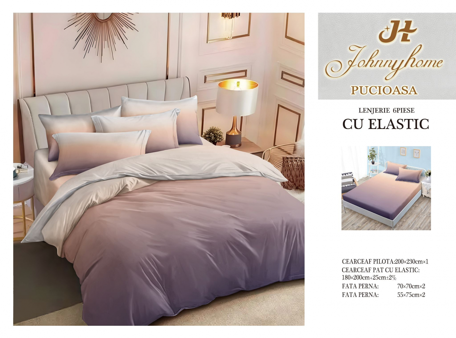 ELEGANT HOME PUCIOASA Lenjerie Pat Dublu, Bumbac Finet, 6 Piese, CU ELASTIC - Ombre Mov / Roz