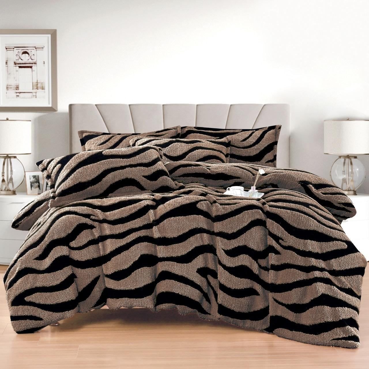 Setul include o pilotă călduroasă, un cearșaf cu elastic pentru fixare perfectă și două fețe de pernă. Imprimeul modern zebra în nuanțe de bej și negru adaugă un plus de stil dormitorului tău.